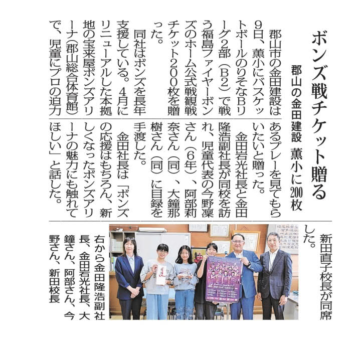 このたび弊社では、SDGsに関わる活動の一環として、弊社がリニューアル工事を手掛けた「宝来屋ボンズアリーナ」で、児童にプロ選手の迫力あるプレーを間近で体感してもらうため、郡山市立薫小学校へ 地元プロバスケットボールチーム「福島ファイヤーボンズ」 の試合観戦チケット200枚を寄贈いたしました。
